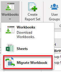2)Click dropdown of Workbooks icon from the ribbon and select Migrate Workbooks. Workbook will be convereted to SplashBI Excel Connect workbook.