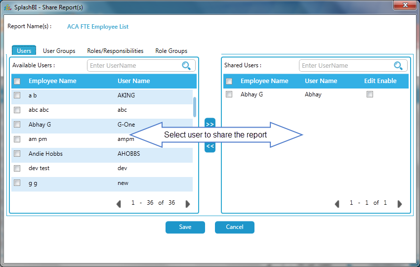 •The end user will notice that Enable is checked, which indicates the users in the list will have access to the reports data and can copy the report if they choose to make any changes for their own personal use.