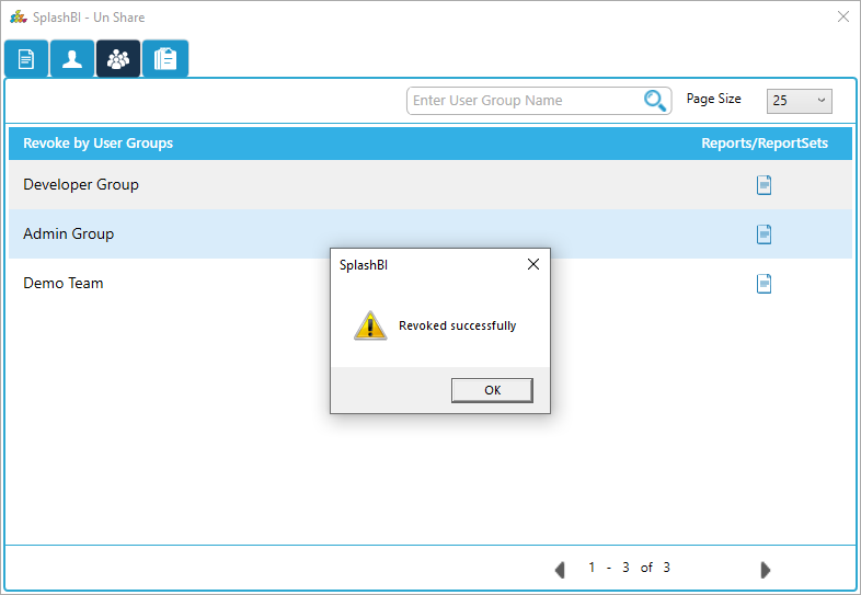 In that section, a window is poped up , now select the required reports from the available reports and click on revoke button for unsharing the user group for the report.